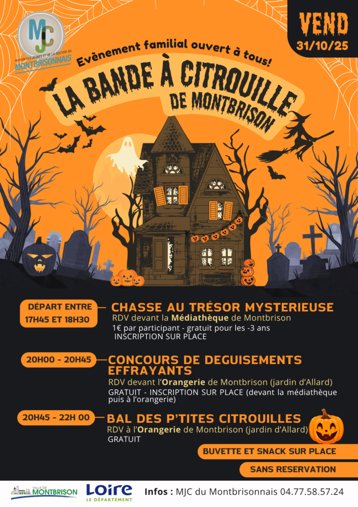 Envie de vivre une soirée d’Halloween à Montbrison inoubliable ? La MJC du Montbrisonnais vous donne rendez-vous le vendredi 31 octobre 2025 pour un événement familial haut en couleurs (et en frissons) : La Bande à Citrouille !